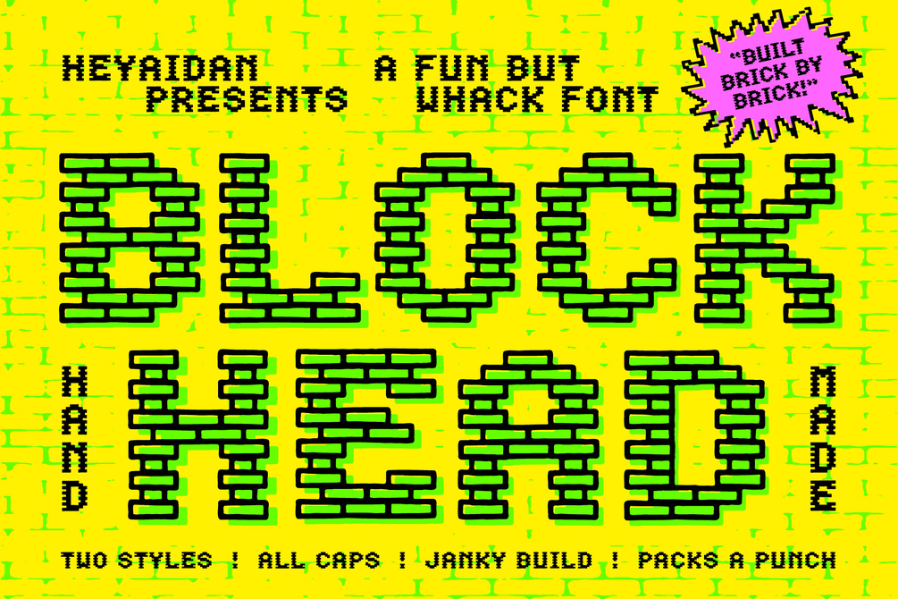 Block Head is an All Caps display font featuring two styles to work with; Solid and Brick. SolidĀ is a filled font with some rough, bit-like edges, while Brick a stroked version that features individual parts that make up the letters.